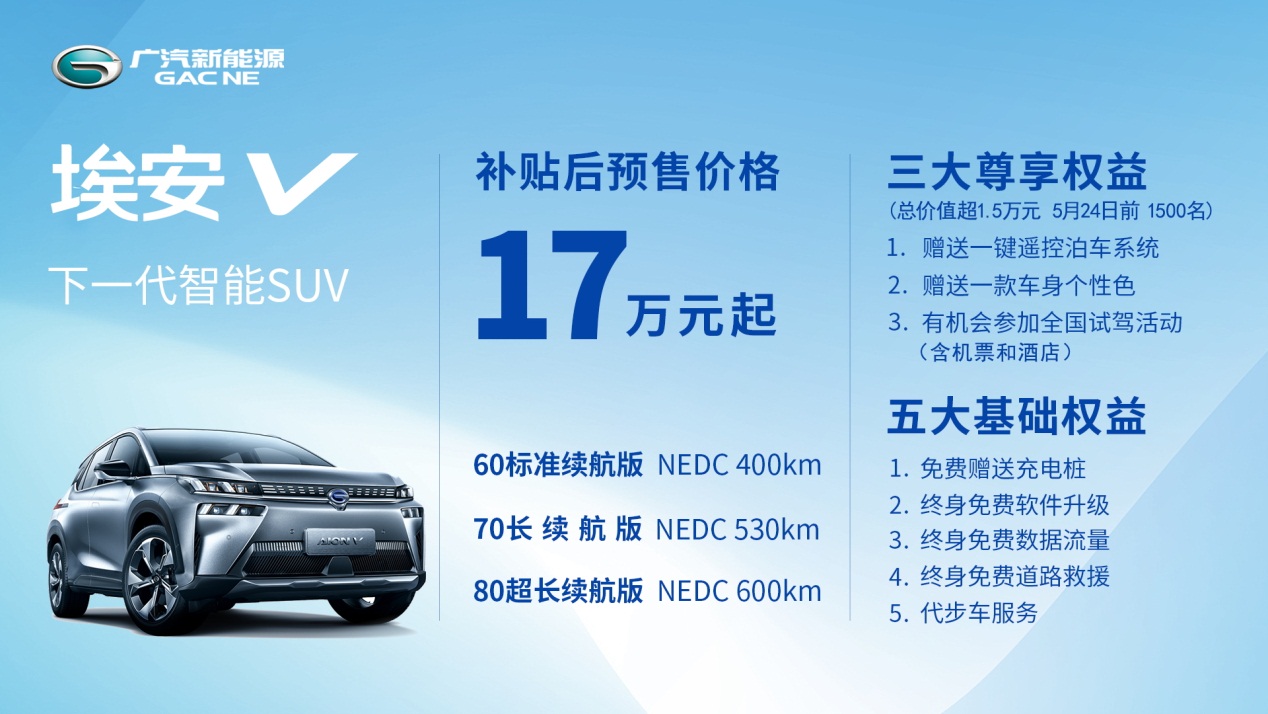 近日,广汽新能源第三款全新产品——AionV(埃安V)以“云预售”的形式全球首发,推出了60标准续航版、70长续航版和80超长续航版三个版本,其NEDC续航分别达到400km、530km及600km,补贴后预售价格17万元起,预计将会在今年6月份-7月份正式上市。