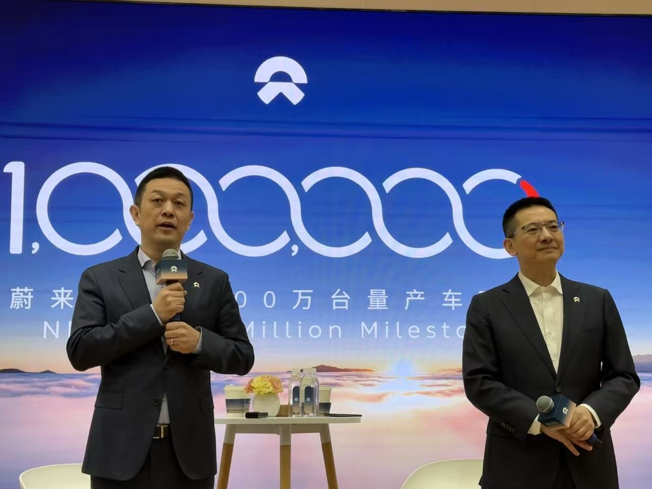 蔚来创始人、董事长、CEO李斌,蔚来联合创始人(左)、总裁秦力洪(右)在第100万台量产车下线媒体沟通会上与媒体对话(刘钊/摄影)