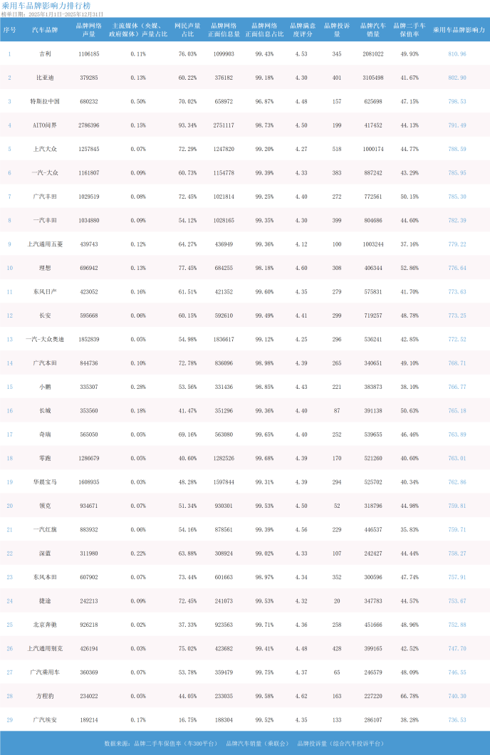 年度影响力榜单清晰显示,头部品牌已然形成了以庞大规模基盘和深厚口碑资产为核心的、难以撼动的竞争优势。位居榜首的吉利汽车,其810.96分的综合影响力得分,源自高达110.6万的年度品牌网络声量和208.1万辆的市场销量所共同构筑的传播与市场双重壁垒,而99.43%的网络正面信息占比则进一步印证了其在庞大用户基数下依然保持了出色的舆情管理与口碑维护能力,充分展现了这家传统巨头在燃油与新能源赛道“双线并进”战略下的卓越体系实力。
