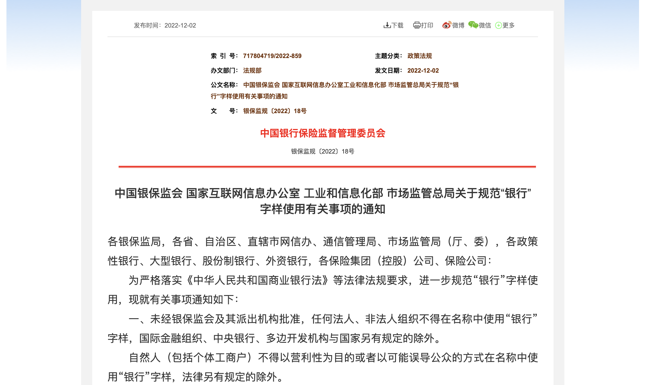 据中国银保监会官网12月2日消息,为整改规范违法使用“银行”字样现象,中国银保监会、国家互联网信息办公室、工业和信息化部、市场监管总局近日联合发布了《关于规范“银行”字样使用有关事项的通知》(以下简称《通知》)。