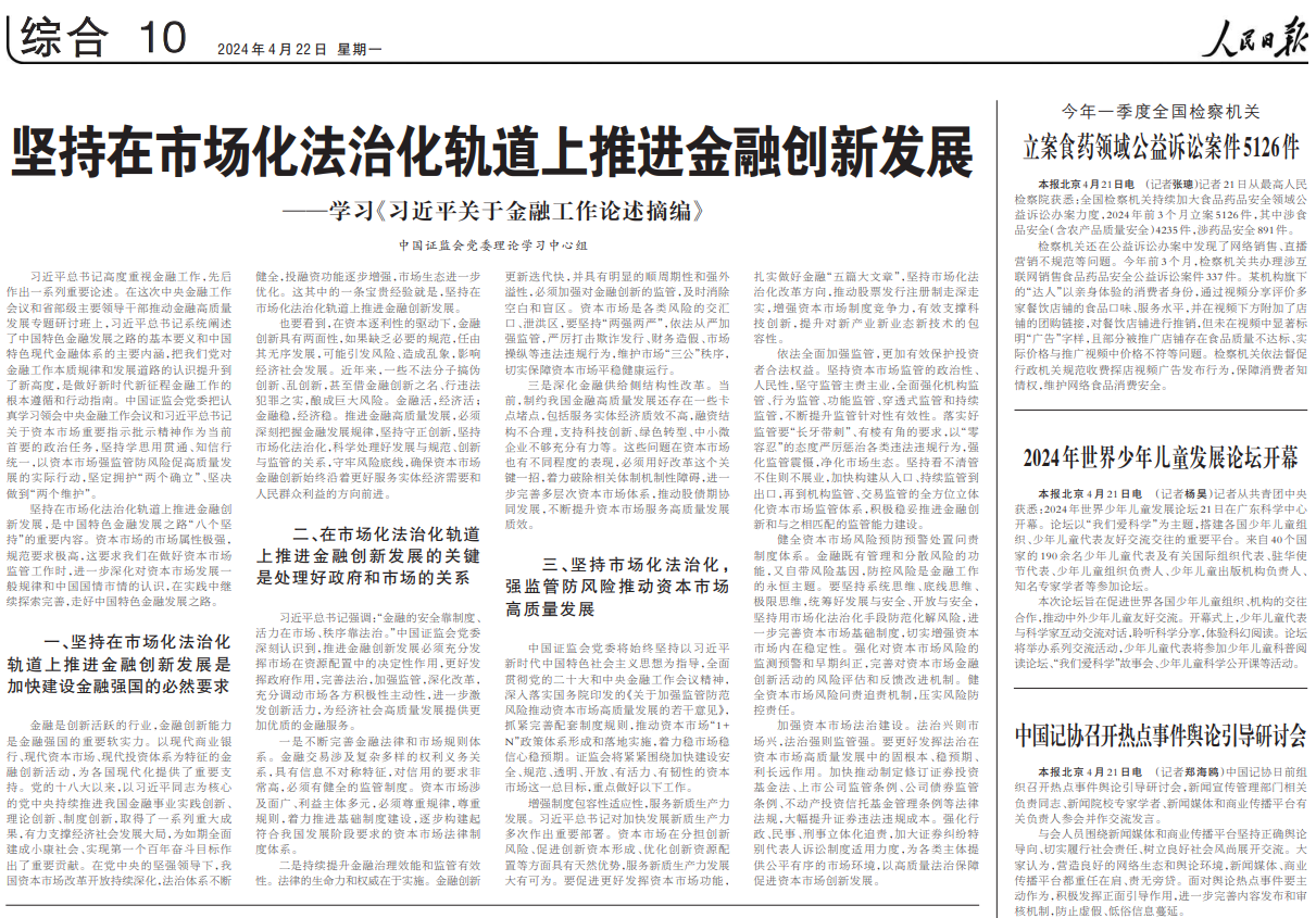 三是深化金融供给侧结构性改革。当前,制约我国金融高质量发展还存在一些卡点堵点,包括服务实体经济质效不高,融资结构不合理,支持科技创新、绿色转型、中小微企业不够充分有力等。这些问题在资本市场也有不同程度的表现,必须用好改革这个关键一招,着力破除相关体制机制性障碍,进一步完善多层次资本市场体系,推动股债期协同发展,不断提升资本市场服务高质量发展质效。