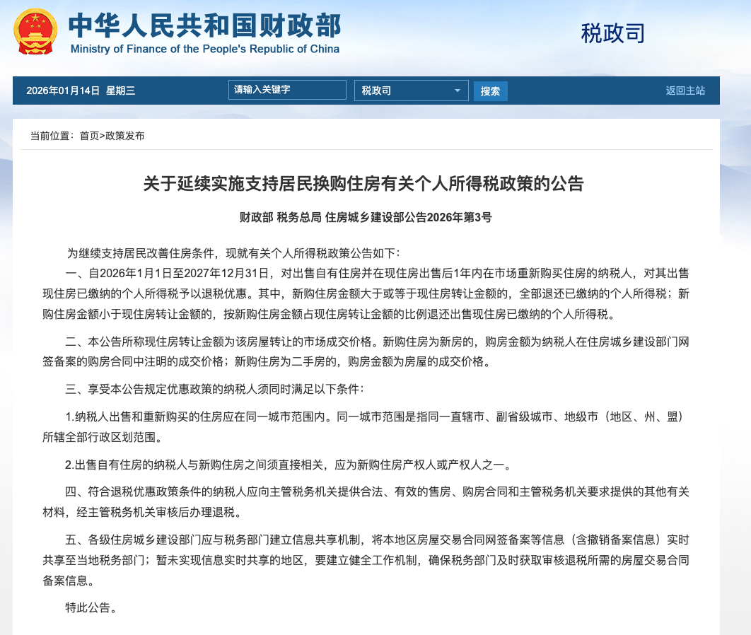 据财政部1月14日消息,财政部,税务总局,住房城乡建设部发布《关于延续实施支持居民换购住房有关个人所得税政策的公告》(以下简称《公告》)。