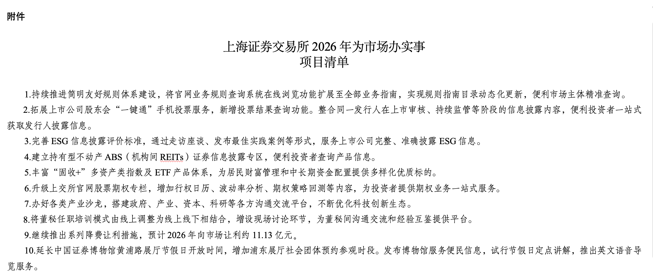 本报讯 (记者毛艺融)为推动中央八项规定精神在上海证券交易所(以下简称“上交所”)落实落细,进一步深化“开门办审核、开门办监管、开门办服务”工作,上交所在认真研究市场各方诉求基础上,结合交易所实际,梳理形成了《上海证券交易所2026年为市场办实事项目清单》(以下简称《项目清单》),近日正式对外发布。