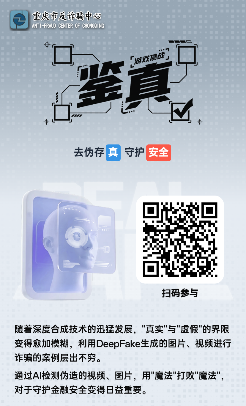 此外,“三件套”还包含针对更广泛观众的AI反诈短剧,真实还原“保本高息”理财骗局,直击痛点;聚焦前沿科技的“鉴真”防深伪H5小游戏,通过模拟深伪诈骗场景,让用户在趣味闯关中掌握识别AI换脸、拟声的技巧,实现从“被动听”到“主动学”的转变。