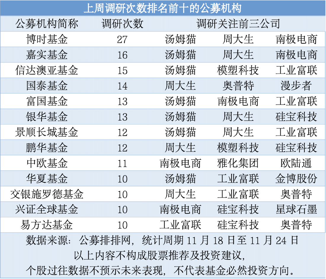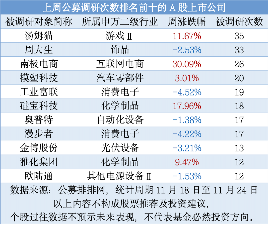 汤姆猫被调研35次居首,当周股价涨幅达11.67%。此外,周大生、南极电商、模塑科技、工业富联、硅宝科技、奥普特、漫步者、金博股份、欧陆通、雅化集团等被调研次数居前,均被调研不少于12次。被调研次数排名前十的11家公司中(含并列),5家公司上周股价上涨,其中南极电商涨幅最大,累计涨幅超30%。