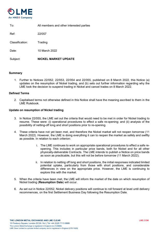 LME具体解释了推迟伦镍复牌的原因,“在第22/055号通知中,我们提出重新开放伦镍交易需要满足的前提条件,其一,重新开盘后可实现安全操作程序;其二,在重新开盘前审慎评估多头头寸和空头头寸安全平仓的可能性。”