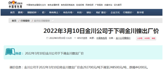 中国有色网发布金川镍下调价格消息(供图:中国有色网)