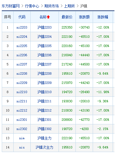 受镍现货价格大幅度下跌等因素影响,北京时间3月11日下午3点收盘时,上期所交易的沪镍主力合约全天处于跌停板,跌幅达到17%,跌停板上封单为1.962万手。东方财富CHOICE终端显示,沪镍各月份合约均告下跌,且合约呈现出“近高远低”趋势,表明市场看淡镍价后市表现。