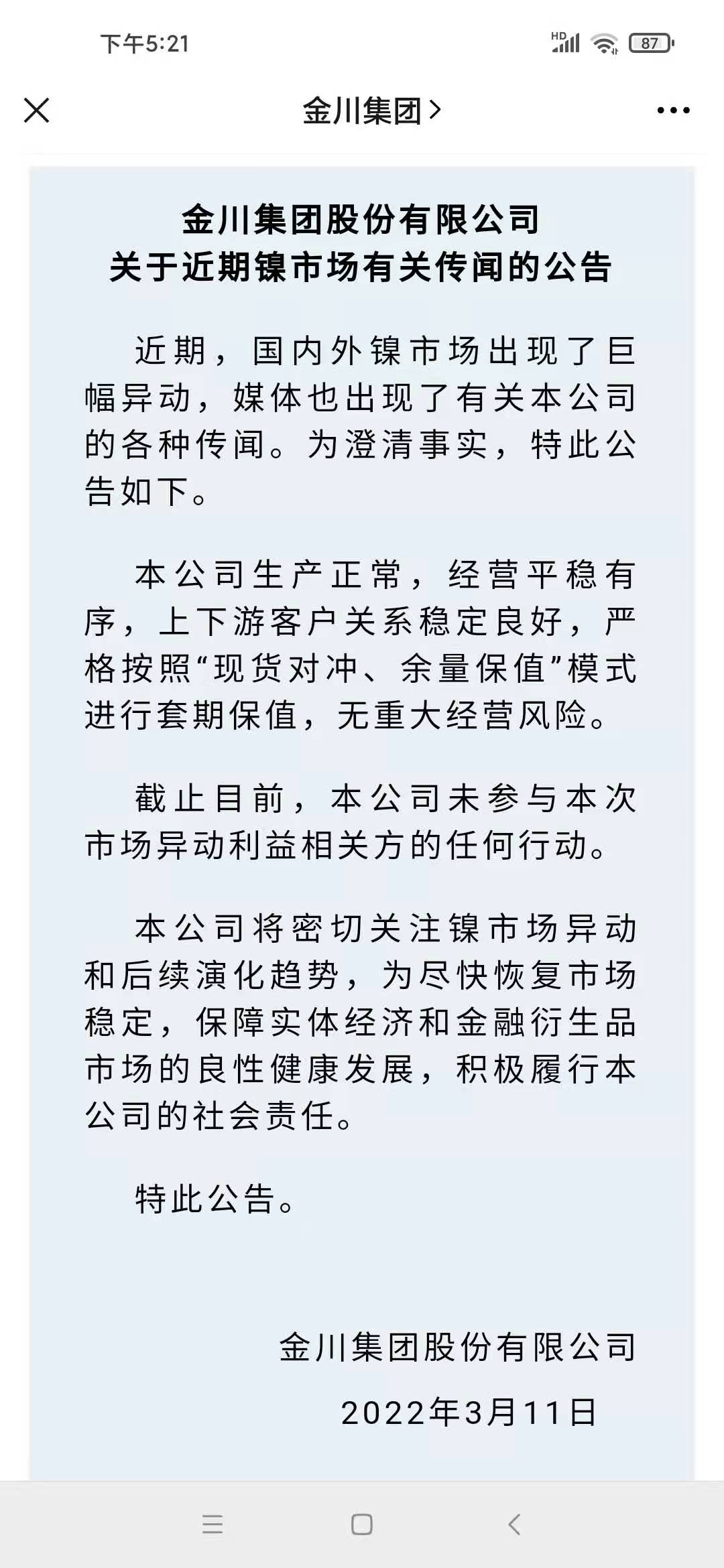 对此,金川集团对上述市场消息在“金川集团”微信公众号中作出澄清,公司生产正常,经营平稳有序,上下游客户关系稳定良好,严格按照“现货对冲、余量保值”模式进行套期保值,无重大经营风险,截至目前,公司未参与本次市场异动利益相关方的任何行动,公司将密切关注镍市场异动和后续演化趋势。