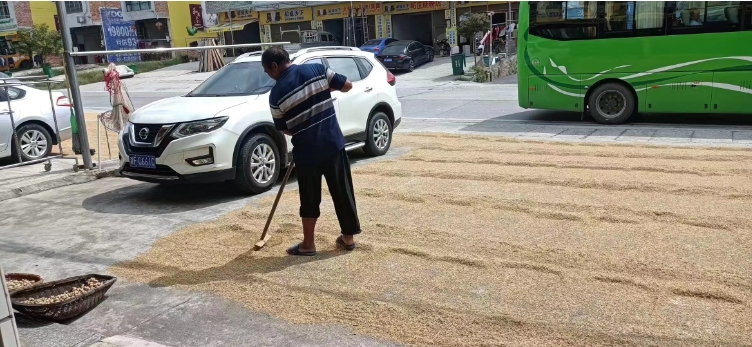 平江农户正在晾晒晚稻(摄影:肖伟)