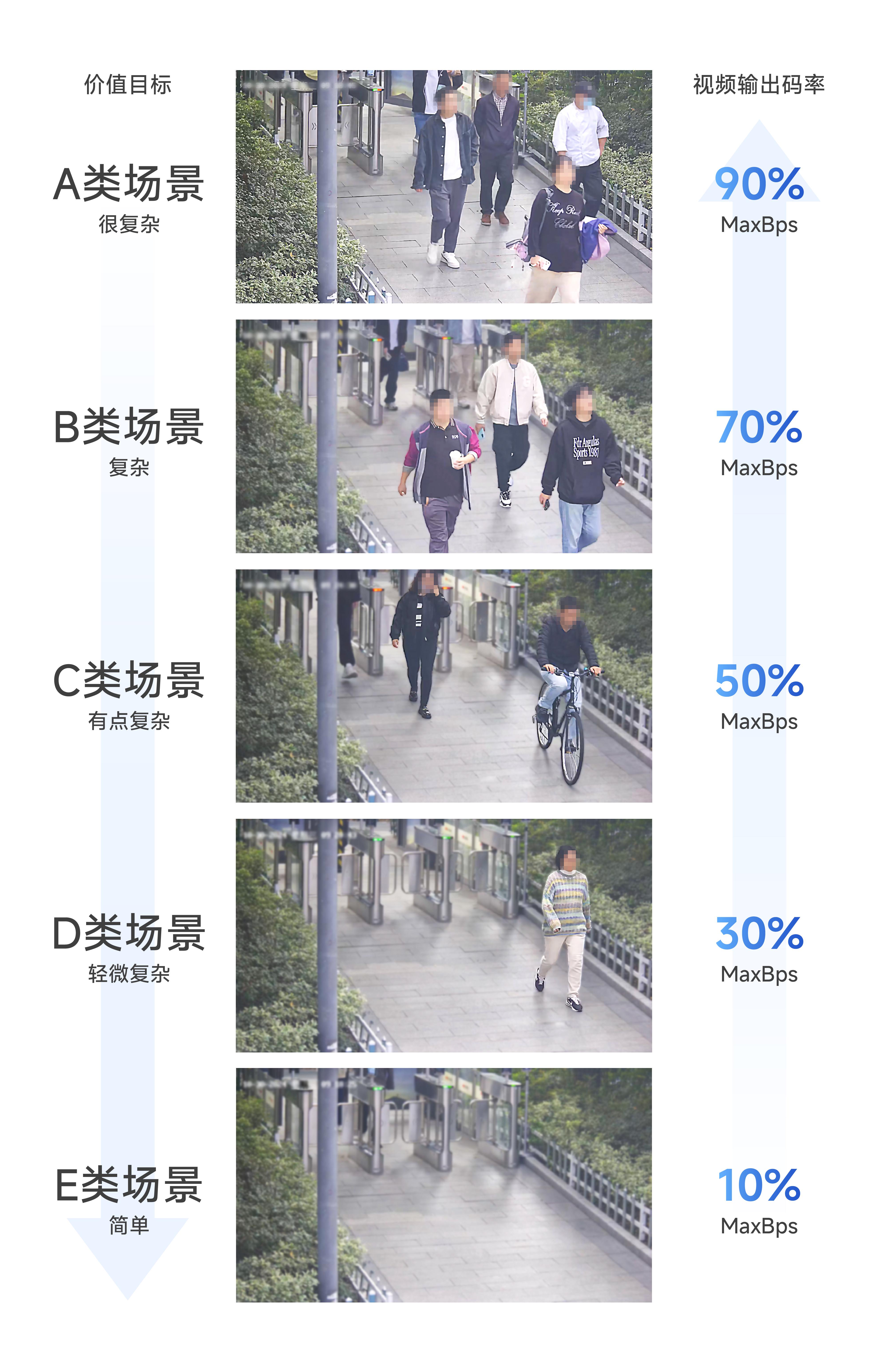 海康威视观澜编码技术以“场景感知”为核心,构建动态适配的智能编码体系,依托动态与静态感知协同运作。动态感知,即实时捕捉场景运动幅度与细节密度,按最大码率MaxBps百分比分配资源,保障复杂场景画质无损;静态感知,则是对静止或低动态画面采用重复帧编码,单帧仅需几十字节,最大化优化存储成本。