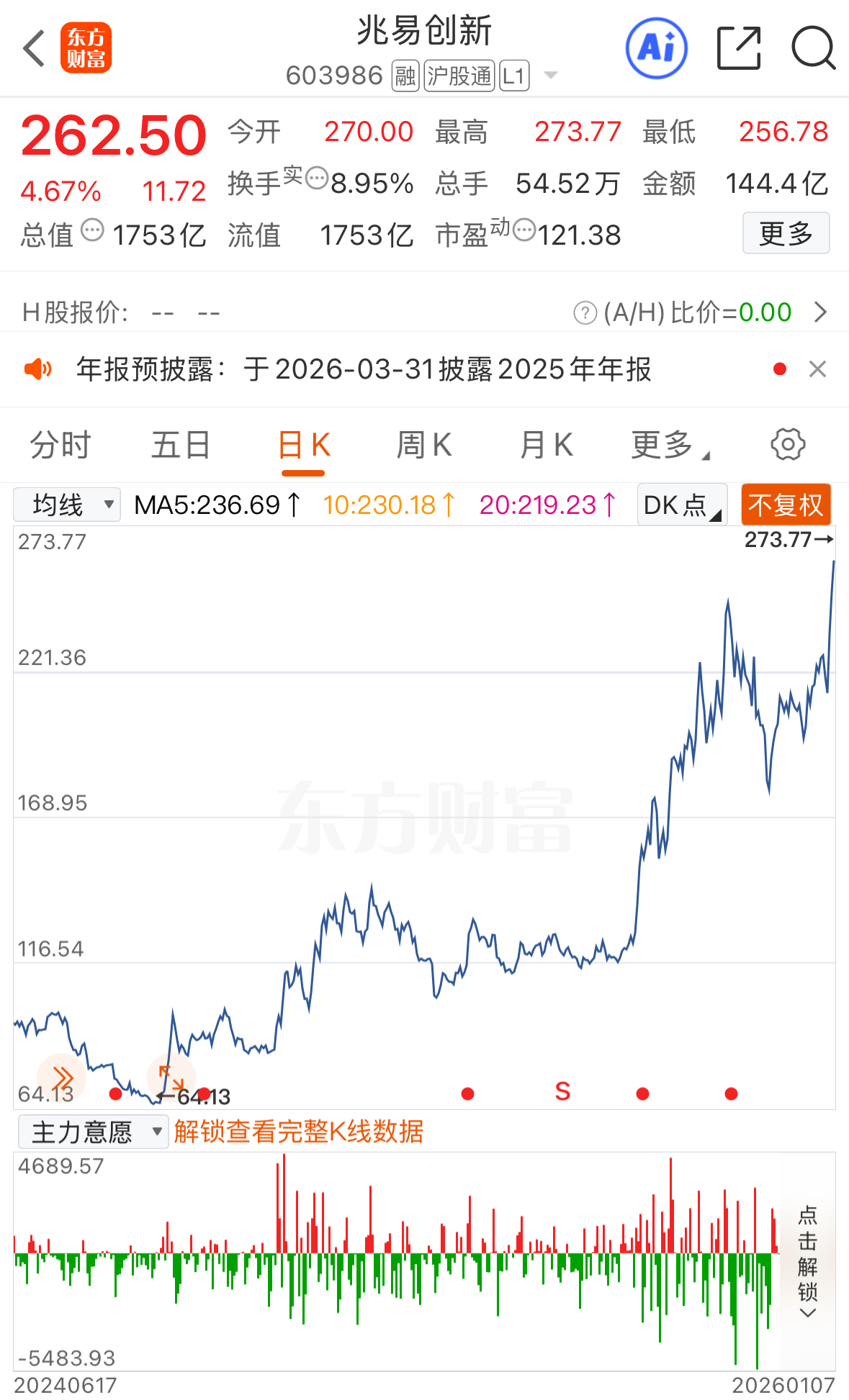 此外,千亿元市值龙头兆易创新早盘一度涨近9%,股价续创新高;截至收盘,尽管兆易创新股价涨幅回落至4.67%,报收262.5元/股,股价仍突破前高。