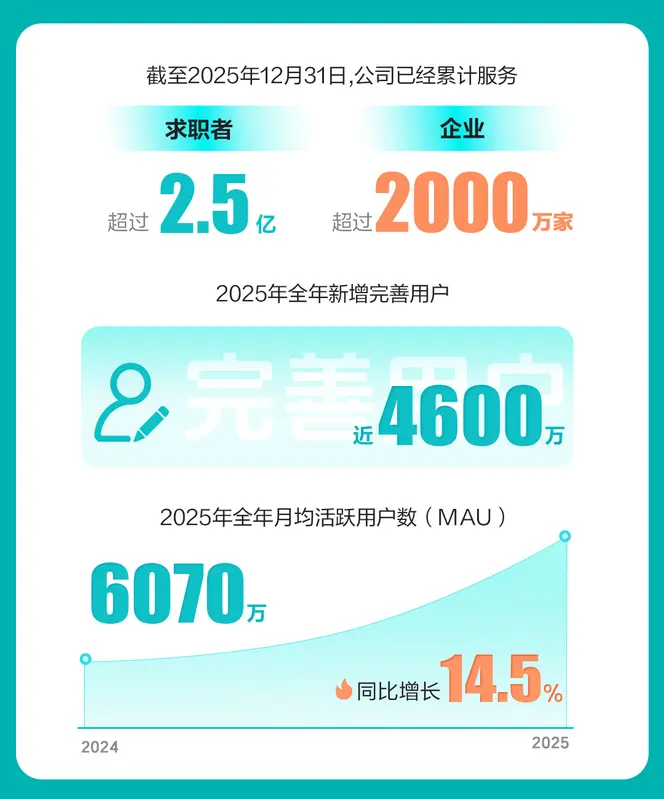 截至2025年12月31日止的十二个月内,公司付费企业客户数达680万,同比上涨11.5%。截至2025年12月31日,公司累计服务超过2.5亿求职者,服务企业总数超过2000万家。