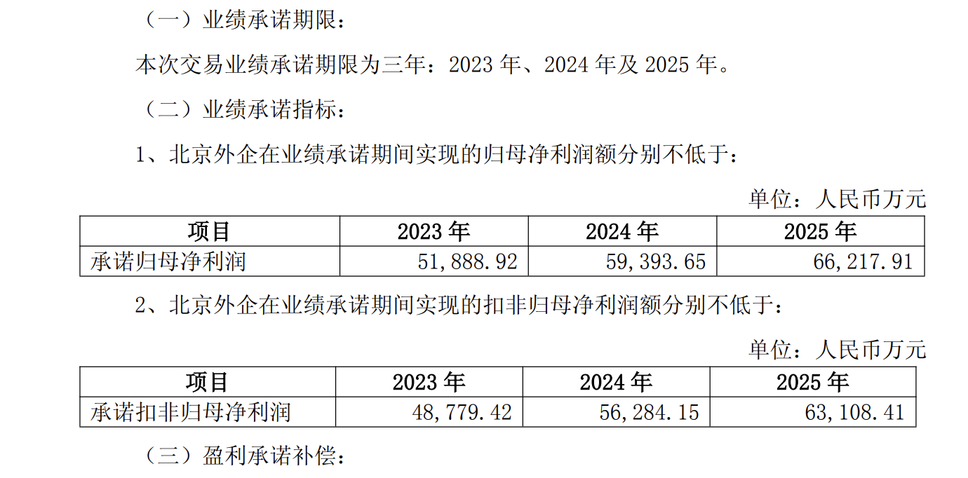 根据北京人力披露的公告显示,协议的业绩承诺期限为2023年、2024年及2025年,分别对应5.2亿元、5.9亿元、6.6亿元的承诺归母净利润;4.9亿元、5.6亿元、6.3亿元承诺扣非归母净利润。