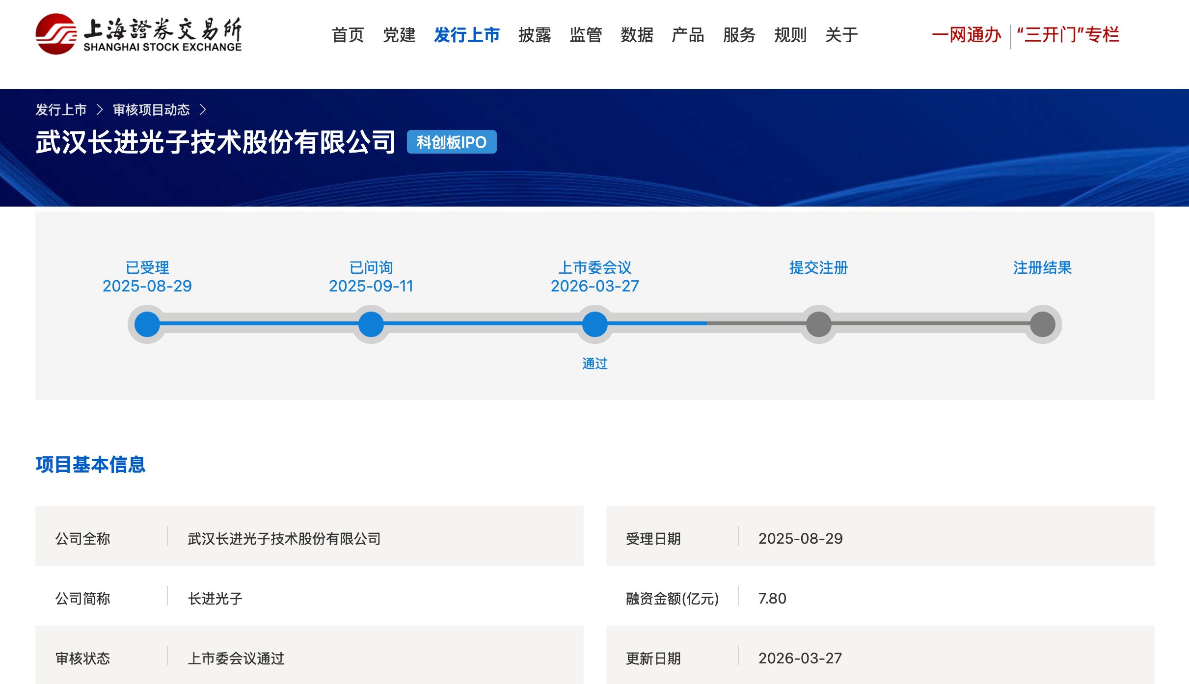 本报讯 (记者毛艺融)3月27日,上交所官网信息显示,武汉长进光子技术股份有限公司(以下简称“长进光子”)IPO申请通过上交所上市委审议。
