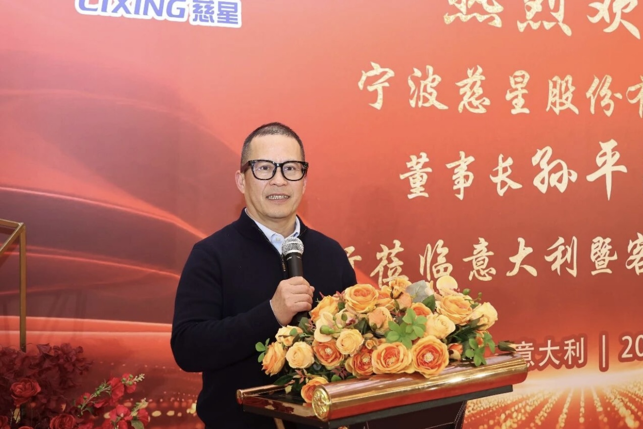 晚宴现场氛围热烈而温馨。首先孙平范董事长登台致辞,向长期以来信任、支持慈星股份发展的广大客户和合作伙伴表示衷心感谢。他表示,慈星股份能在全球针织机械领域稳步前行,离不开每一位客户的不离不弃与鼎力相助,尤其是意大利及欧洲市场的合作伙伴与公司一路同行、共同成长。未来,慈星股份将继续加大技术创新力度,提升产品质量和服务水平,进一步深耕欧洲市场,与广大客户携手并进、合作共赢。