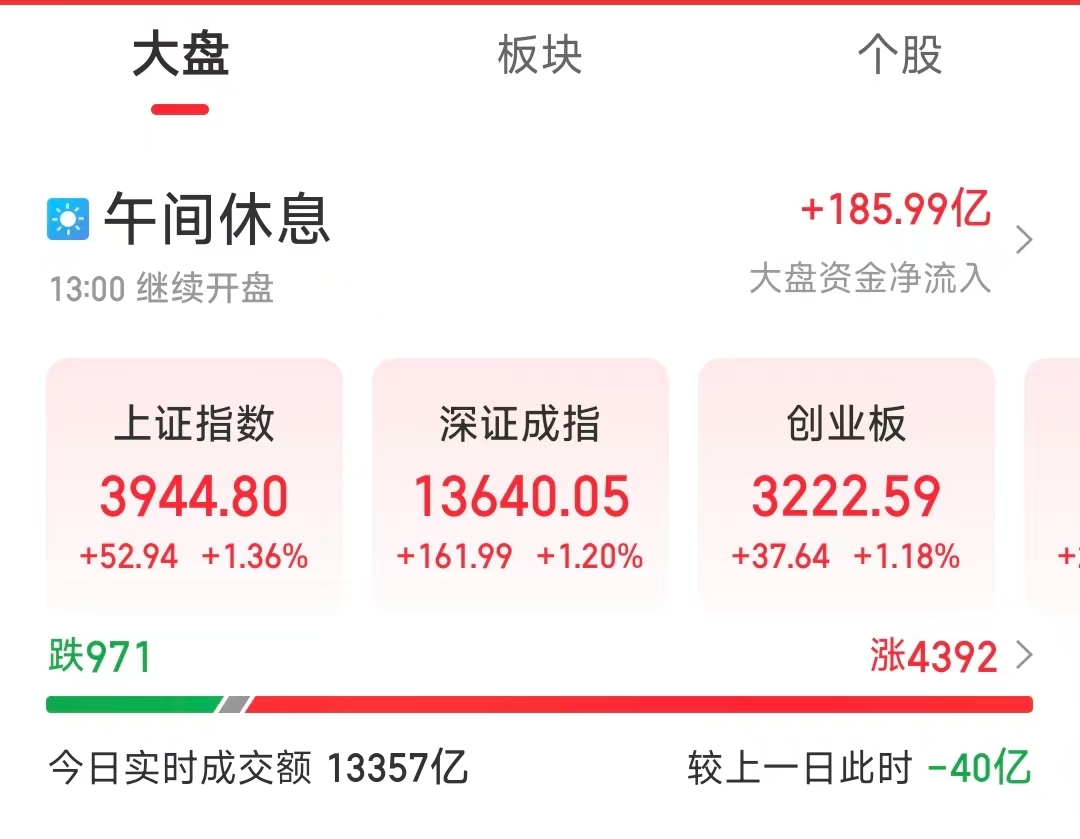 周三(4月1日),三大股指强势反弹,全线飘红。截至上午收盘,上证指数涨幅达1.36%,报3944.8点;深证成指和创业板指涨幅分别为1.2%和1.18%;沪深两市合计成交额13277.84亿元,总体来看,两市个股涨多跌少,超4000只个股实现上涨。