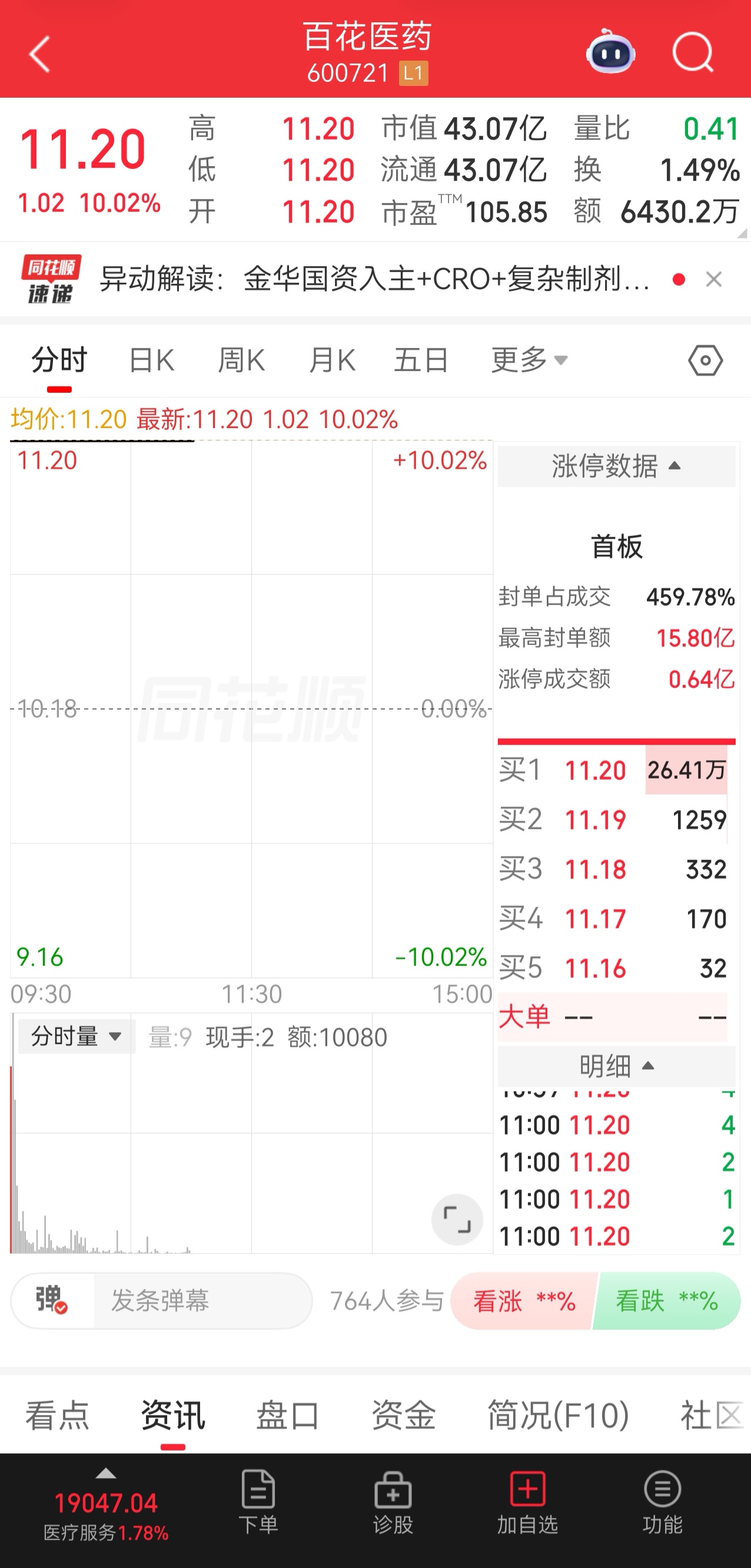 4月8日,百花医药(证券代码:600721)复牌首日开盘即封涨停,报11.20元/股,截至记者发稿时,涨停板仍被牢牢封死。