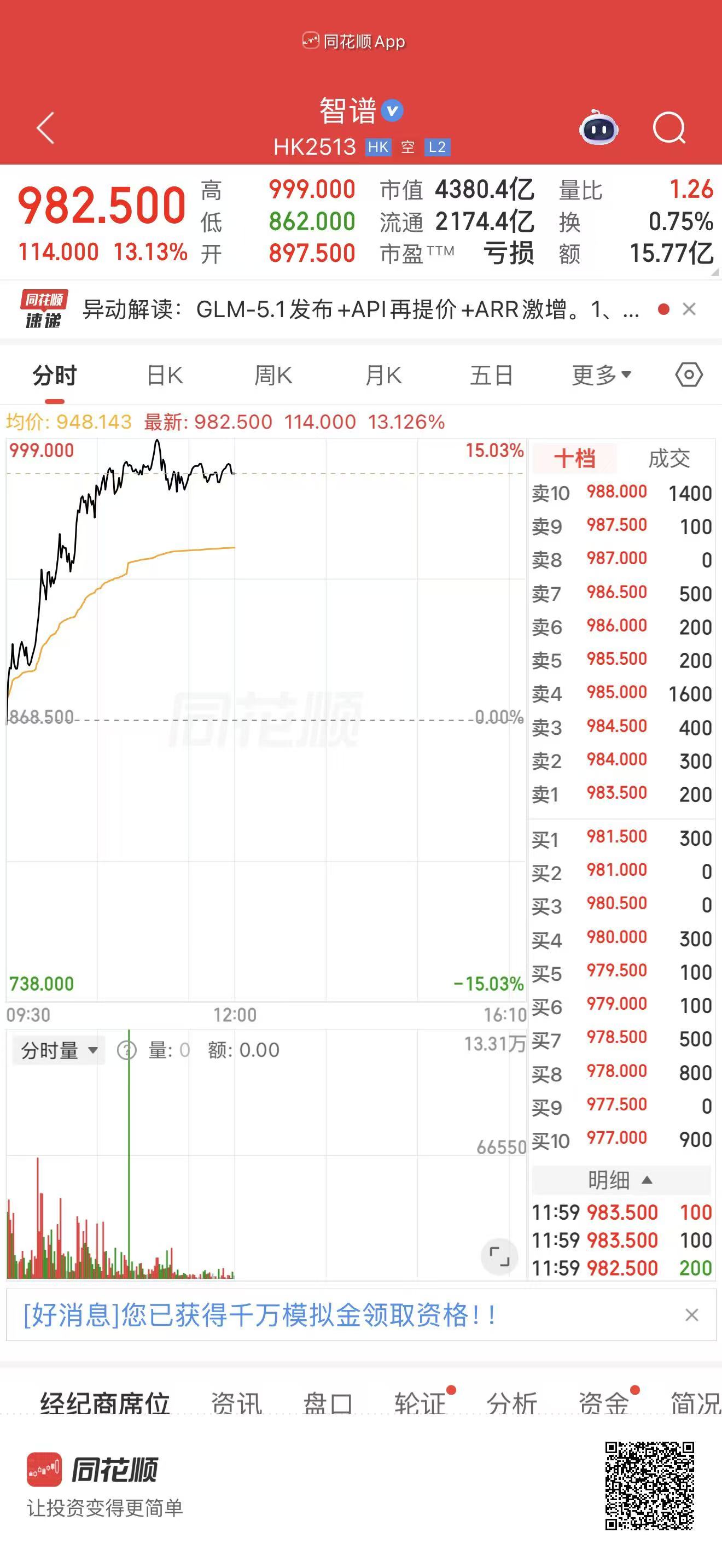 本报讯 (记者梁傲男)4月9日早盘,北京智谱华章科技股份有限公司(以下简称“智谱”,股票代码“HK2513”)开盘快速拉升,盘中最高涨超15%,股价触及每股999港元,续刷新高。