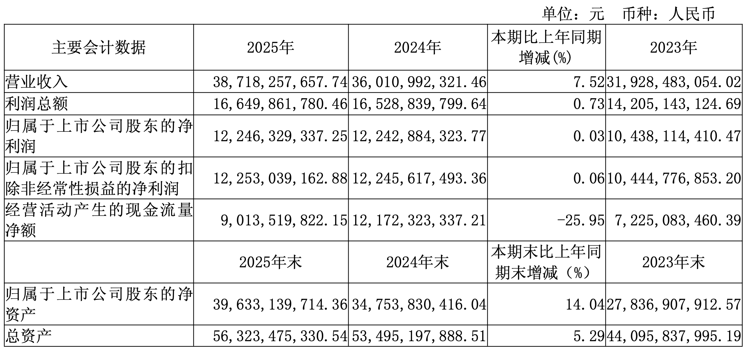 4月22日晚间,山西杏花村汾酒厂股份有限公司(以下简称“山西汾酒”)披露2025年年度报告。年报显示,公司2025年实现营业收入387.18亿元,同比增长7.52%;实现归属于上市公司股东的净利润122.46亿元,同比增长0.03%。在交出这份成绩单的同时,公司还披露了2025年度利润分配预案,拟向全体股东每10股派发现金股利65.60元(含税)。按截至2025年12月31日的总股本计算,此次拟派发现金股利约80.03亿元。截至4月22日收盘,山西汾酒股价为136.91元/股,总市值达1670亿元。