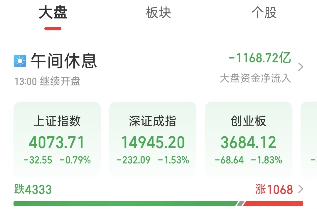 周四(4月23日)市场呈现震荡调整态势。截至上午收盘,上证指数下跌0.79%,报4073.71点;深证成指下跌1.53%,报14945.20点;创业板指下跌1.83%,报3684.12点。沪深两市半日合计成交额约1.95万亿元。总体来看,个股跌多涨少,共有1068只个股实现上涨。
