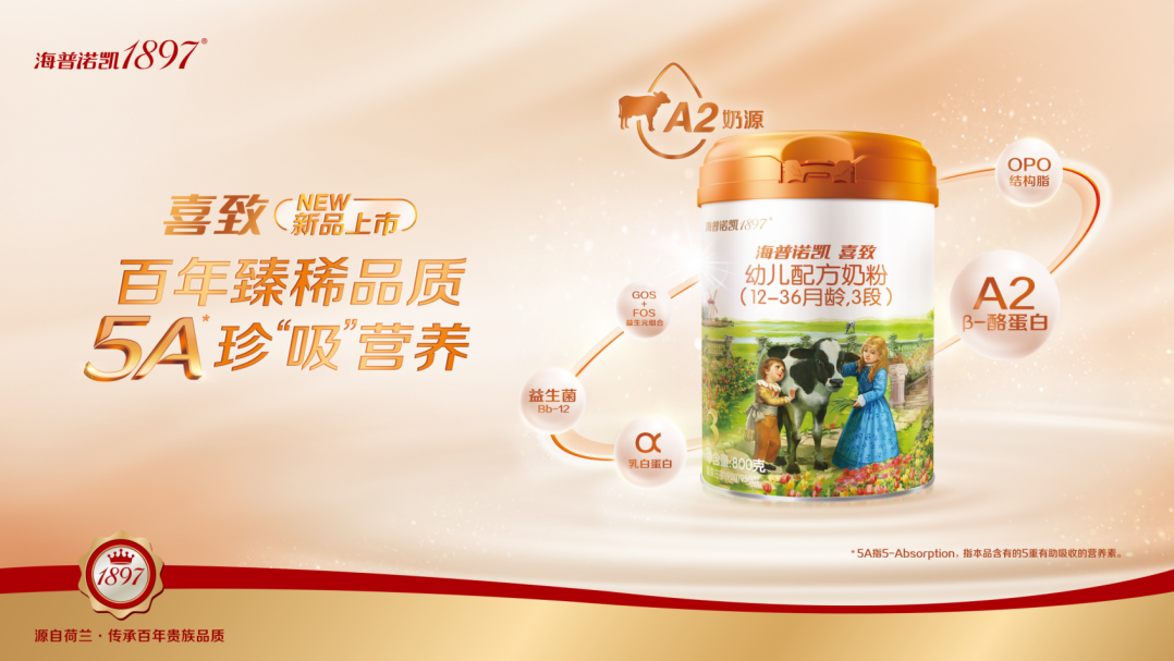 A2奶源的营养性和稀缺性受到了母婴家庭的普遍关注与高度认可。据FiorMarkets发布的报告显示,全球A2奶市场在2018年价值58.9亿美元,预计到2026年将以17.03%的复合年增长率飙升至213.9亿美元。近几年A2奶的知名度逐渐在国内乳制品市场打开,但由于奶源稀缺、技术门槛高、储终端认识不足等原因,入局企业并不多。海普诺凯1897利用以强有力的全产业链和全球科研团队为支撑,进行的更深入、更精准的战略布局,推出了品牌旗下首款A2奶源产品海普诺凯1897喜致。凭借源自荷兰百年自家牧场严苛臻选出的纯种A2荷斯坦功勋母亲牛的更珍稀的A2奶源+行业突破性5A珍“吸”配方的强强组合,从营养价值层面延展了A2奶源这一细分领域的深度。海普诺凯1897向细分市场的强势出击,为品牌带来新的增量发展曲线同时,品牌竞争力也将得到进一步提升。