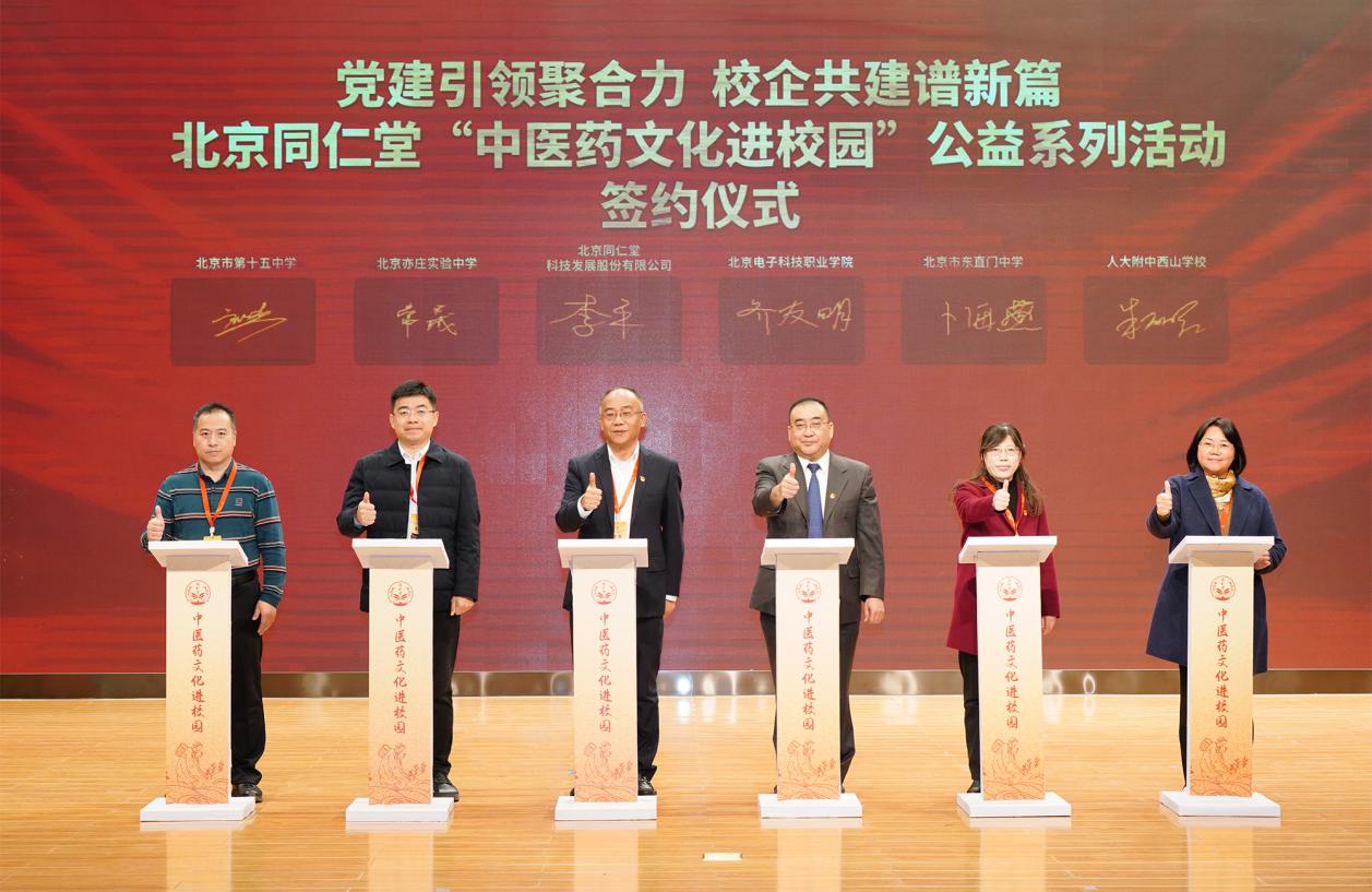 今年9月份以来,同仁堂科技公司先后与北京亦庄实验中学、人大附中西山学校、北京市第十五中学、北京市东直门中学、北京电子科技职业学院和北京市第四中学等六所项目示范院校建立了党建、共建战略合作,以药为“钥”,一同开启校园学子探求国粹文化之门。活动当天,合作各方正式签署战略合作协议,标志着北京同仁堂“中医药文化进校园”项目迈上新台阶。