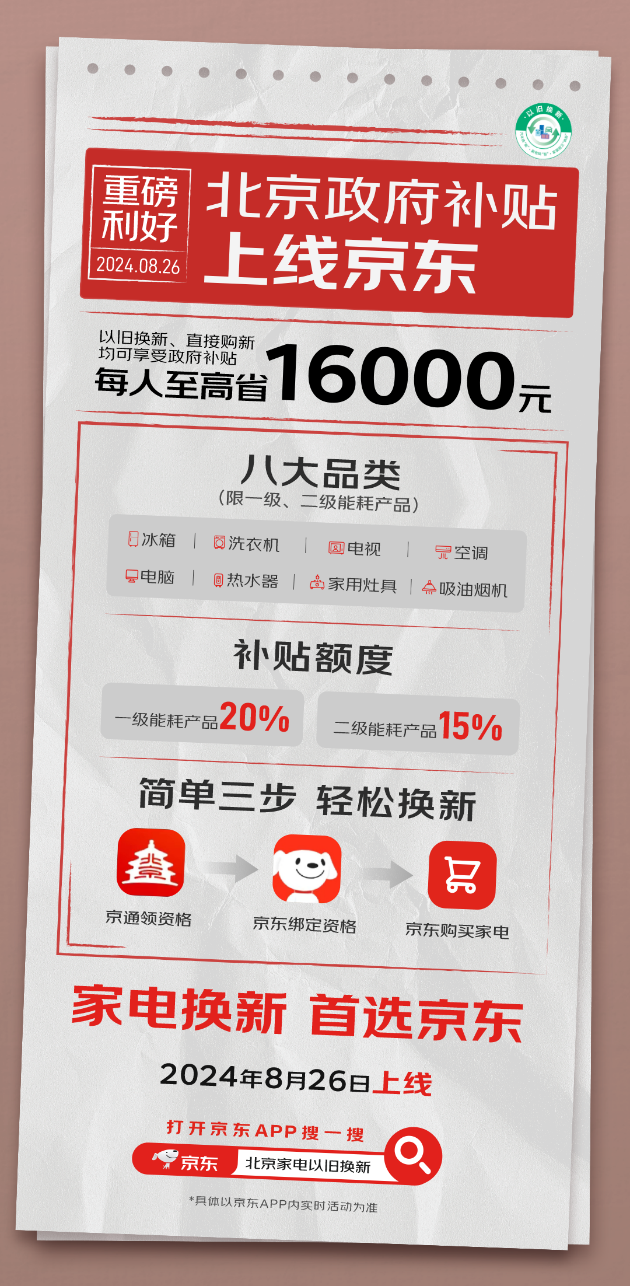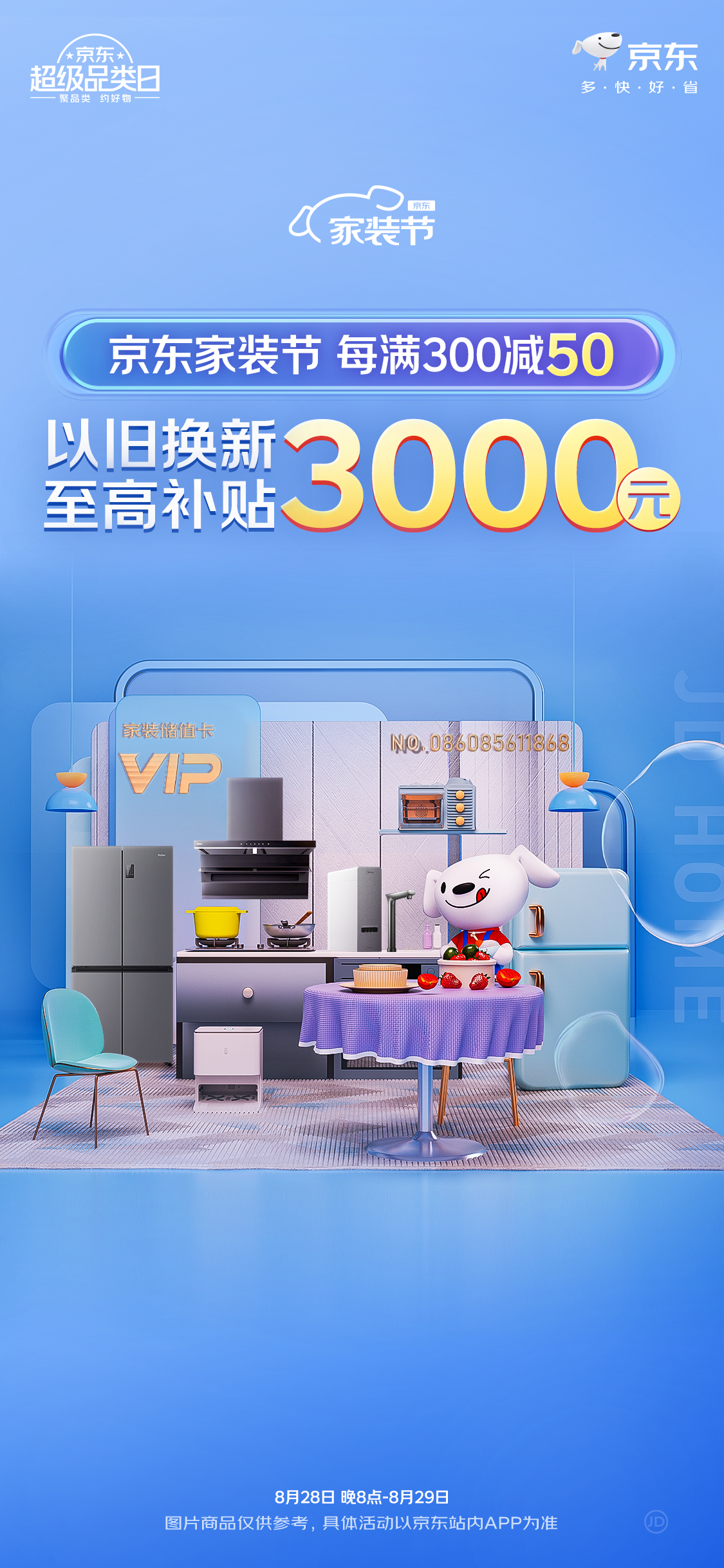 8月28日晚8点,京东秋季家装节正式启动!即日起至9月9日期间,京东携手上百个家电家居品牌为消费者带来空调、电视、冰箱、洗衣机、烟灶等大小家电好物,以及马桶、浴室柜、智能锁、床品、百货等家居产品,更有闪电新品以旧换新至高补贴3000元、家装卡充值至高赠送2500元等福利,打开京东App搜索“家装节”或“京东家装节”即可直达活动会场,下单家电家居低价好物。值得注意的是,北京用户在京东选购冰箱、洗衣机、电视、空调、热水器、家用灶具、吸油烟机等,达到一二级能效或水效的8类家电产品,还能再叠加政府真金白银补贴,每人每类产品至高补贴2000元。