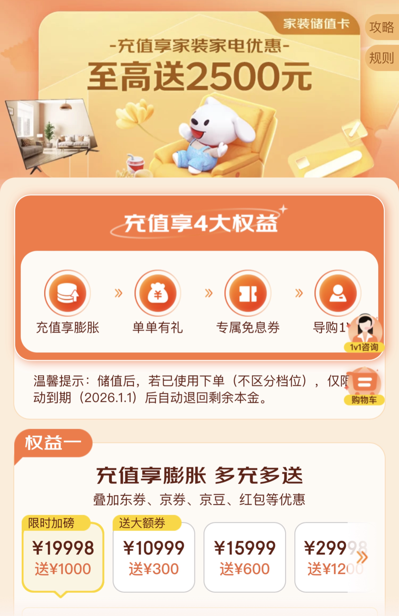 此外,为了让消费者可以省心省钱焕新家,京东秋季家装节还特别推出“家装储值卡”加磅活动,不仅有限时充值19998元送1000元,还有充值10999元送300元、充值15999元送600元、充值29998元送1200元、充值49998元送2500元供您选择。相当于在原有优惠基础上再送福利,买大家电的同时还能免费得小家电。