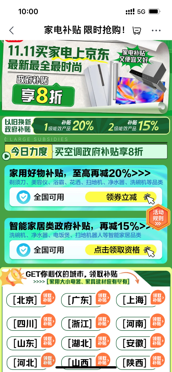 在多重补贴加持下,家电品类迎历史低价时刻,全国多地陆续开启了家电消费的高潮。作为“国补”政策的承接平台,京东目前开启了超20省市家电换新活动专题页面,通过加大备货、新品上新、组合优惠、服务升级,让好产品、好价格、好服务直达用户,让国家政策红利更好、更快、更便捷地覆盖更多消费者。