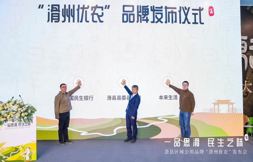 图:安阳市委常委、滑县县委书记李明东,中国民生银行总行办公室副主任刘震子,本来生活集团首席运营官曾强,代表三方正式启动“滑州优农”品牌。