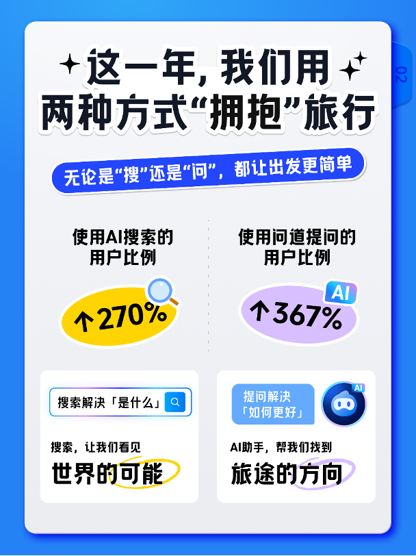 报告数据显示,2025年,在搜索中使用AI规划旅行的用户比例同比提升270%,而深度使用AI问答产品“问道”的用户规模更是同比增长367%。旅行已从单纯的信息查询,演进为情绪调节与生活延伸的重要方式。搜索框负责解决“是什么”,AI对话框开始回应“如何更好”。