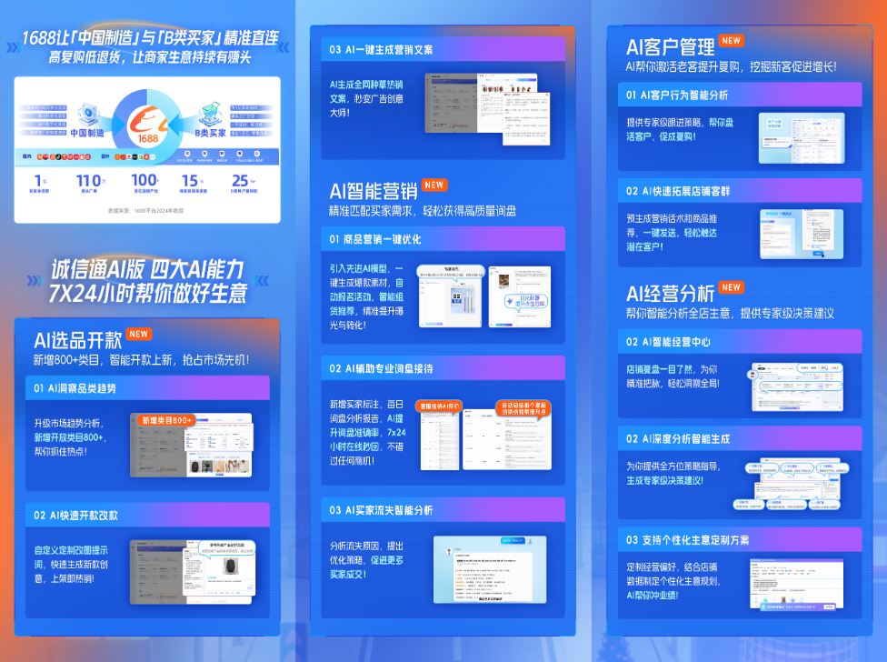 据悉,诚信通AI版通过AI选品开款、AI智能营销、AI客户管理、AI经营分析四大核心能力,7x24小时助力生意全流程,帮助商家从传统经营向智能经营模式升级,降低中小企业生意门槛,让每个中小企业拥有自己的生意Agent,让每一个源头厂商的生意更简单。