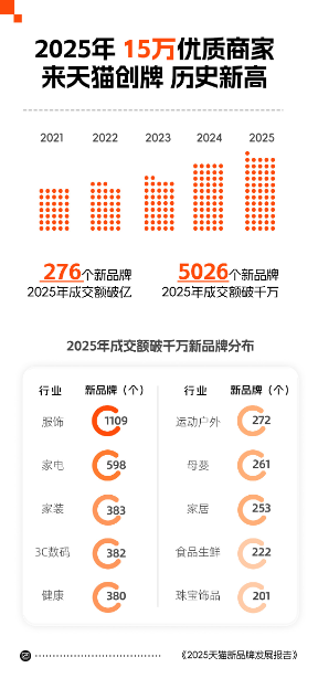 本报讯 (记者梁傲男)1月12日,天猫发布《2025年度新品牌发展报告》:过去一年,超15万个优质新商家来天猫创牌,规模创下历史新高。开店当年成交额即破亿元的品牌数量同比增长超40%;开店3年内的新品牌,有276个年成交额破亿元,5026个新品牌年成交额破千万元,各项数据均创历史新高。