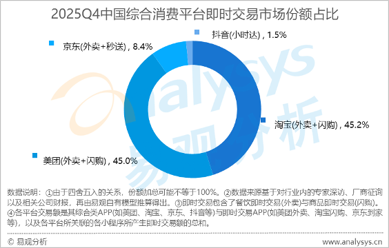 本报讯 (记者梁傲男)3月14日,第三方研究机构易观分析发布即时零售市场报告显示,2025年第四季度淘宝闪购即时交易市场份额为45.2%,美团为45.0%,两者份额差距仅0.2个百分点,即时零售市场呈现多平台竞争态势;京东即时交易市场份额为8.4%,位列第三。