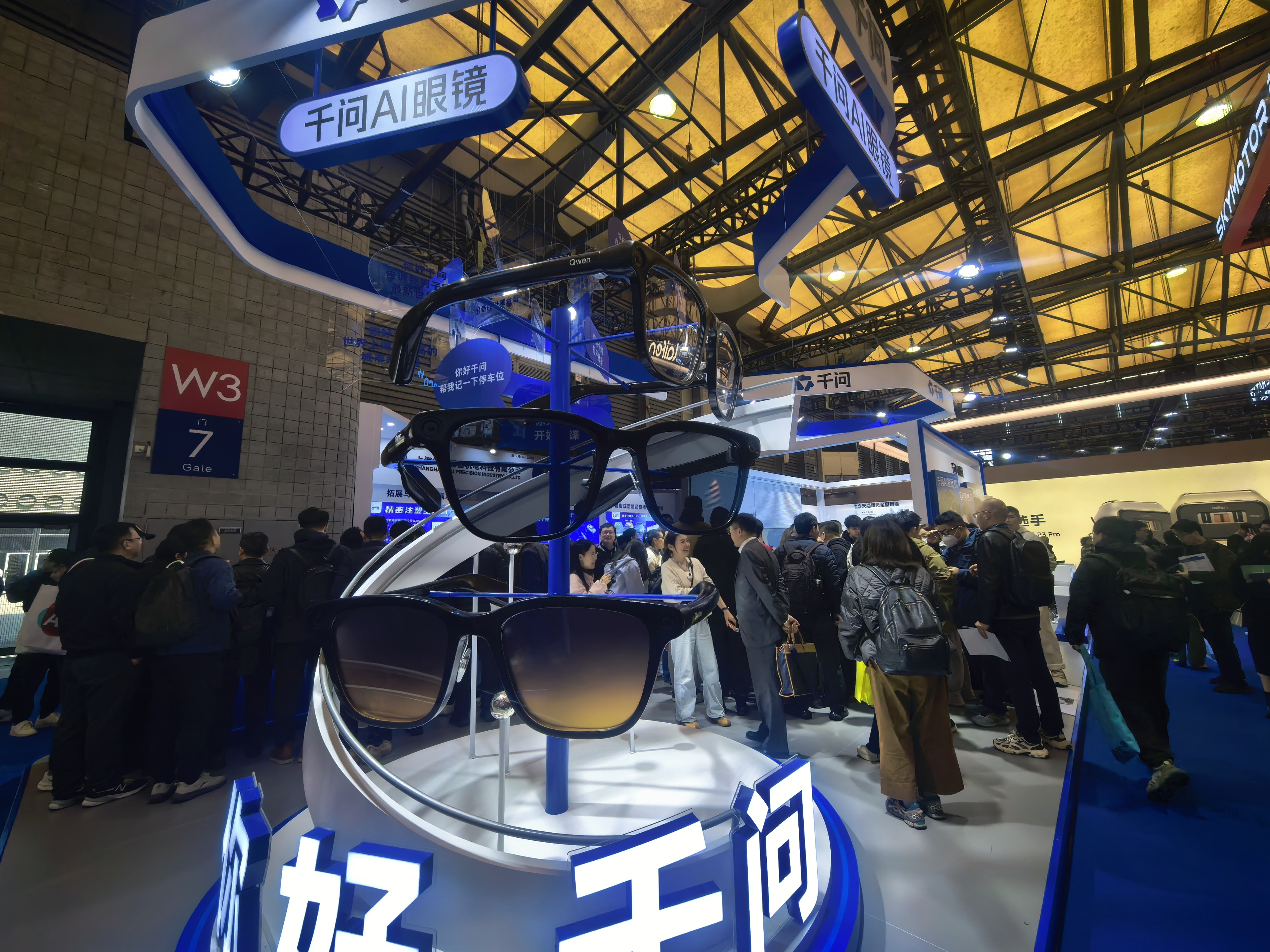 AWE是全球三大家电及消费电子展之一。在今年的展区现场,千问AI眼镜吸引大量观众排队体验。展台上多台设备被轮流试戴,许多观众从语音唤醒AI助手开始,依次尝试拍照、翻译和音乐等功能。眼镜时尚日常的造型也收获了观众好评。