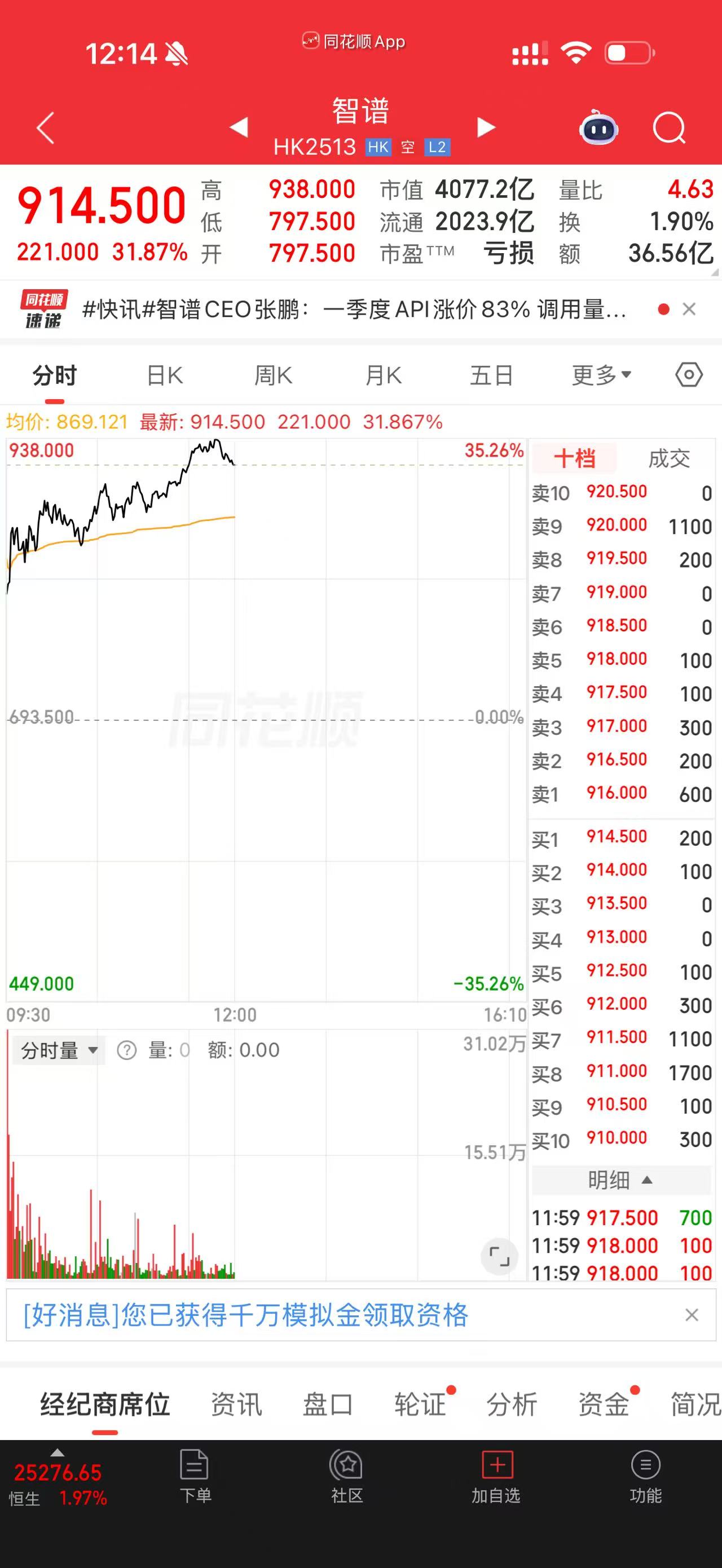 4月1日早盘,北京智谱华章科技股份有限公司(以下简称“智谱”,股票代码“HK2513”)股价大涨。盘中最高涨超35%,触及每股938港元,续刷历史新高。截至上午收盘,智谱股价为每股914.5港元,上涨31.87%,总市值达4077.2亿港元。