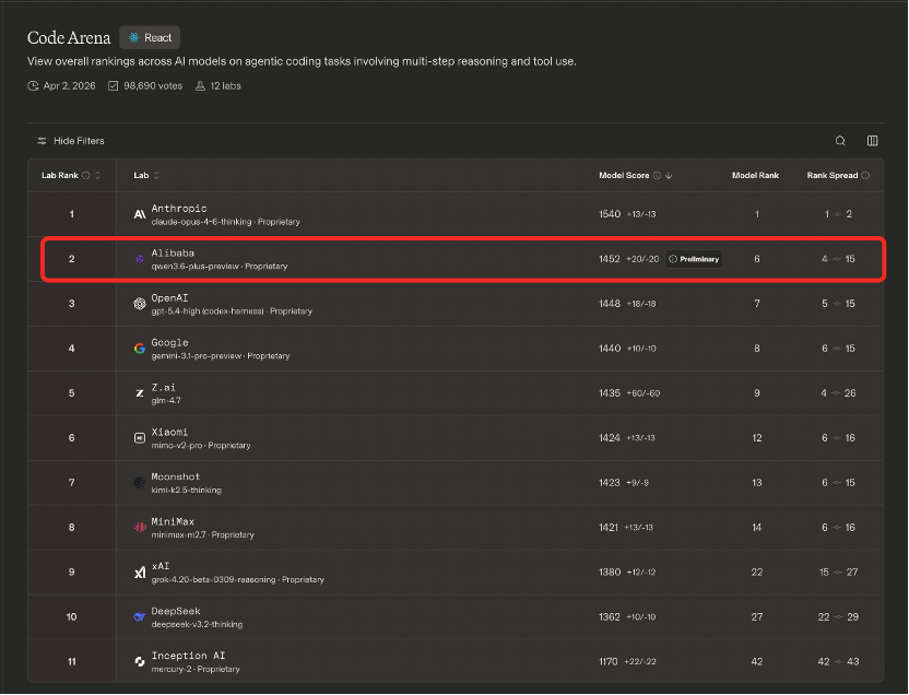 榜单数据显示,千问3.6得分仅次于Anthropic旗下的Claude-Opus-4.6-Thinking(1540分),以4分优势领先OpenAI最新发布的GPT-5.0-High(1448分),并以12分差距超越Google的Gemini 3.1 Pro Preview(1440分)。这意味着,在最具挑战性的AI Coding和Agent任务中,千问3.6展现出与全球顶级大模型比肩甚至更优的代码生成与工程化能力。此外,在全面评估AI编程能力的CodeArena榜单中,Qwen3.6-Plus同样位居国产模型之首。凭借这一成绩,阿里巴巴在全球AI实验室排名中升至第四,仅次于Anthropic、OpenAI和Google。