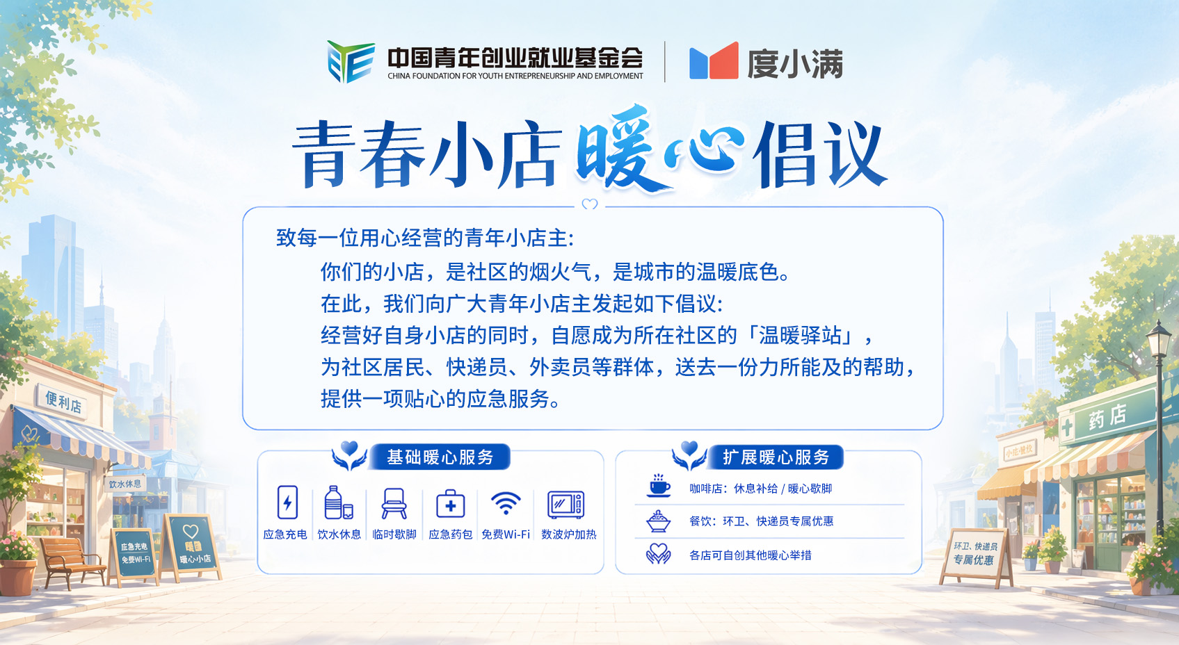 2026年4月24日,在五四青年节前夕,一场聚焦“青年创业”与“社区温暖”的双向奔赴正式开启。中国青年创业就业基金会和度小满共同发起“青春小店暖心倡议”,号召已加入“青年小店榜样计划”(以下简称“计划”)的超1000家青年店主们行动起来:在经营好小店的同时,给身边的社区居民、新就业群体,送去力所能及的帮助和应急服务。