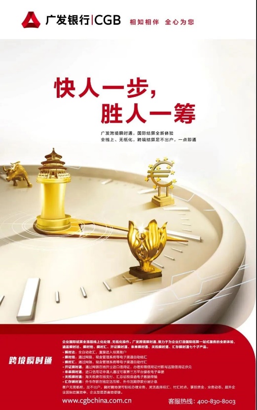 “跨境瞬时通”系列线上国际结算服务涵盖开证瞬时通、来单瞬时通、关税瞬时通、汇存瞬时通、瞬时达、瞬时结、瞬时汇、瞬时查等八大产品,支持企业在线提交业务申请或资料,办理收付汇、信用证开证及押汇、关税缴纳及海关税费保函信息电子传输、外币存款定活互转等国际业务。通过便捷的线上化处理,节约企业人力、物力成本,为外贸稳定提供有力的金融支持。广发银行更为客户准备四个“零”的在线开户服务,即境内本外币账户的“零”接触开户、“零”开户手续费、“零”转账手续费、“零”融资业务手续费。