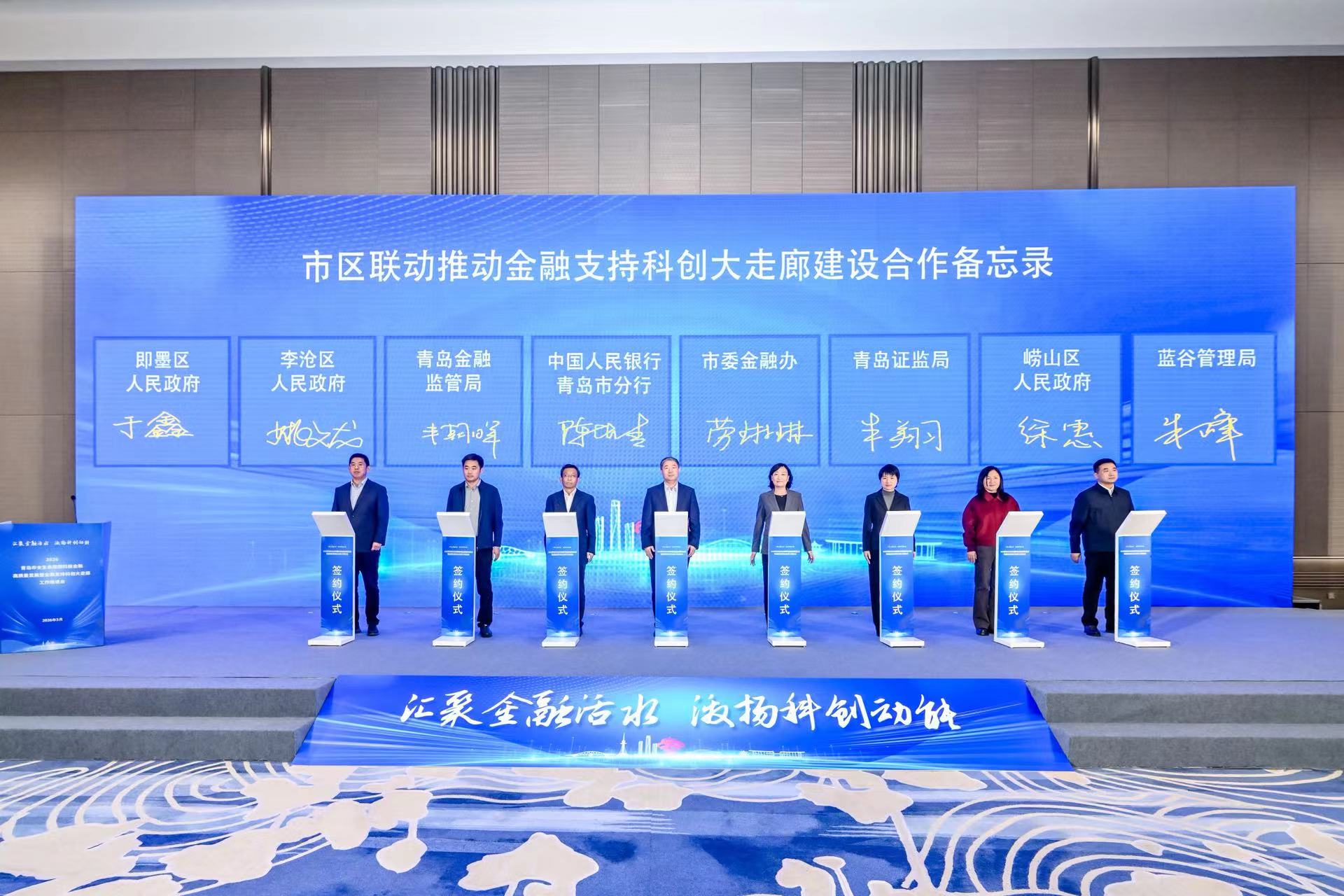 在签约仪式环节,人民银行青岛市分行、青岛市委金融办、青岛金融监管局、青岛证监局、李沧区、崂山区、即墨区、青岛蓝谷管理局联合签署《市区联动推动金融支持科创大走廊建设合作备忘录》,人民银行青岛市分行、即墨区、青岛蓝谷管理局共同签署《海洋科技城金融服务合作协议暨推动即墨区经济金融高质量发展合作备忘录》,加强市、区(市)两级沟通协作,共同为科创大走廊、海洋科技等重大城市战略、重点领域赋能。
