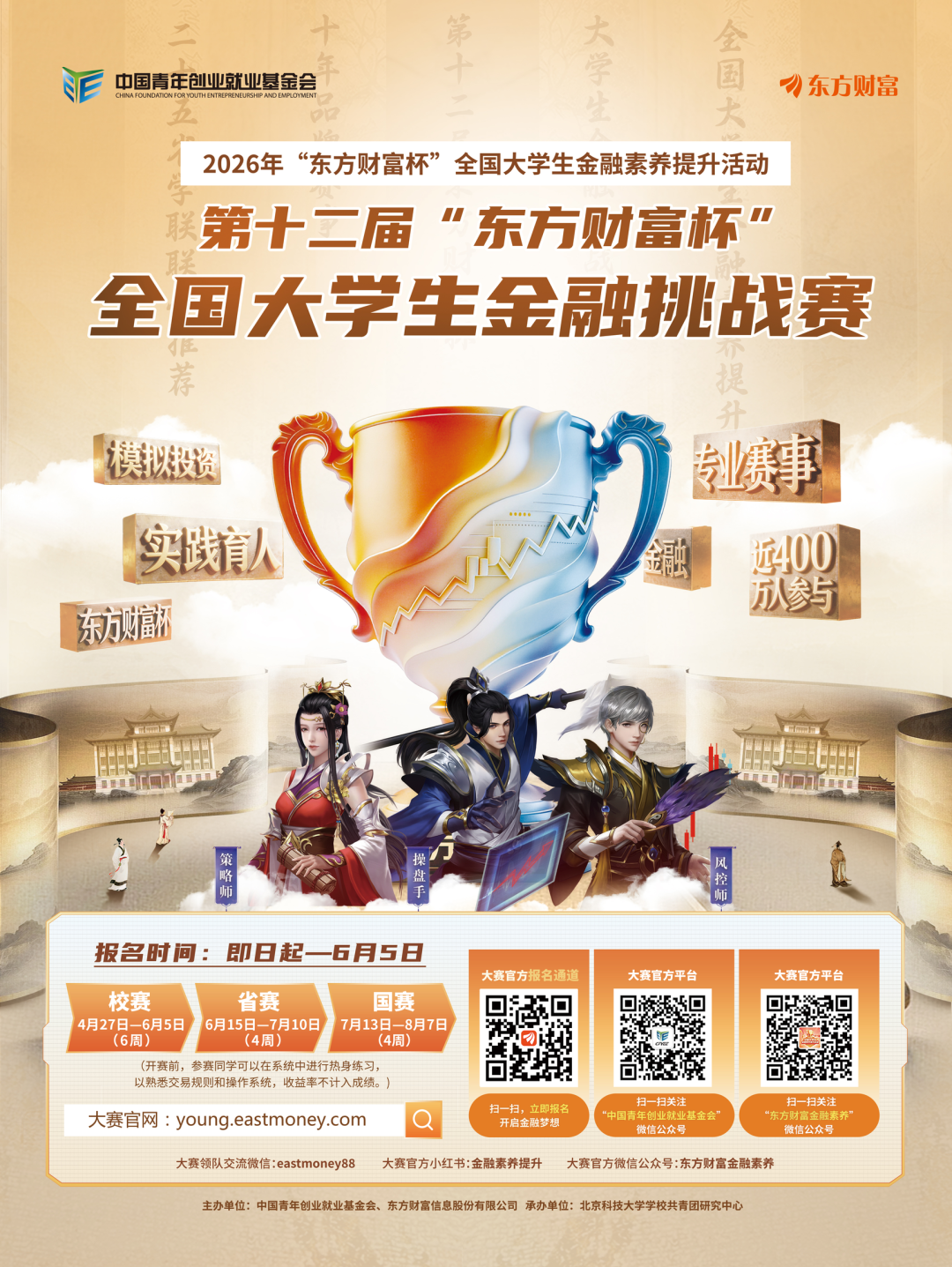 近日,由中国青年创业就业基金会、东方财富信息股份有限公司联合主办的第十二届“东方财富杯”全国大学生金融挑战赛正式拉开帷幕。本次大赛面向全国高校学生免费开放,以模拟交易为核心,构建集知识学习、技能实训、竞技比拼于一体的专业化金融实践平台,助力提升青年学子金融素养与实操能力,为金融强国建设注入青春力量。