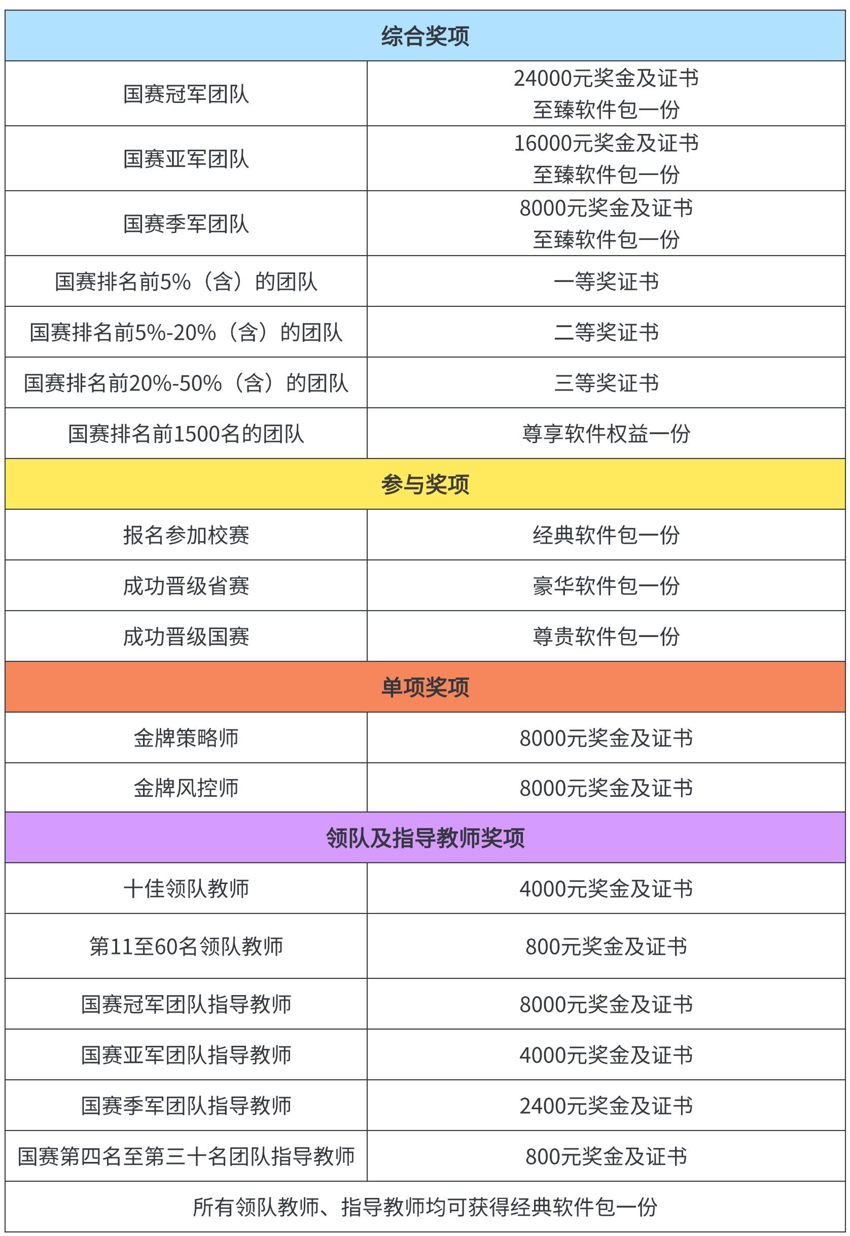 值得关注的是,本届大赛设置了丰厚的奖励体系,覆盖学生、指导教师及领队教师三大群体,不仅有丰厚的现金奖金、荣誉证书,还配套多等级软件权益与专属礼包,全方位激励师生积极参与。同时,大赛特别增设金牌策略师、金牌风控师单项奖,重点表彰在赛事中表现突出的专业型选手,进一步激发参赛学子的竞技热情与专业潜力。