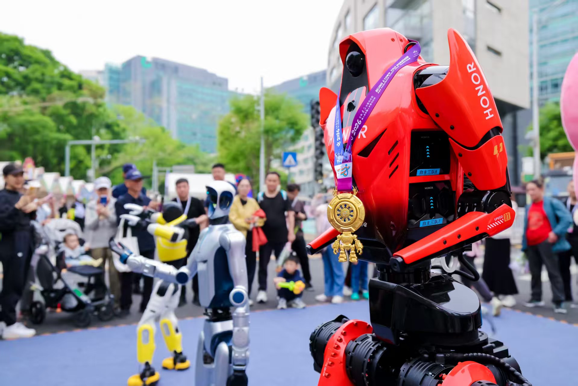 在北京亦庄半程马拉松赛事获得机器人马拉松冠军的“闪电”人形机器人与“天气仔”机器人等均来到了现场。在展示区域,“闪电”等人形机器人吸引了大量观众围观拍照,不少人第一次看到“闪电”,纷纷表示,“它刚在亦庄马拉松夺冠,太酷了”“没想到能在这儿见到冠军机器人,想合影!”