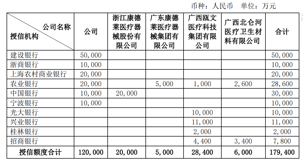 根据公司及子公司浙江康德莱医疗器械股份有限公司、广东康德莱医疗器械集团有限公司、广西瓯文医疗科技集团有限公司、广西北仑河医疗卫生材料有限公司2024年的经营规划和业务发展需要,公司及上述子公司拟申请的银行综合授信额度为179400万元。该额度拟用于向商业银行办理短期流动资金贷款、中长期项目贷款、银行承兑汇票、信用证开证、投标保函、履约保函、预付款保函、付款保函、质量保函、供应链金融、商票保贴等用途。