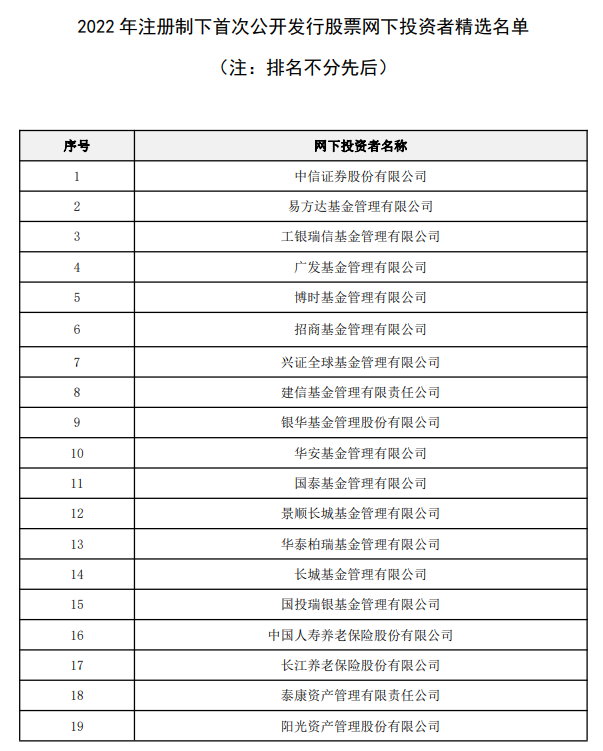 据中证协官网消息,11月25日,中证协发布2022年注册制下首次公开发行股票网下投资者精选名单,中信证券、易方达基金、工银瑞信基金等19家机构入榜。
