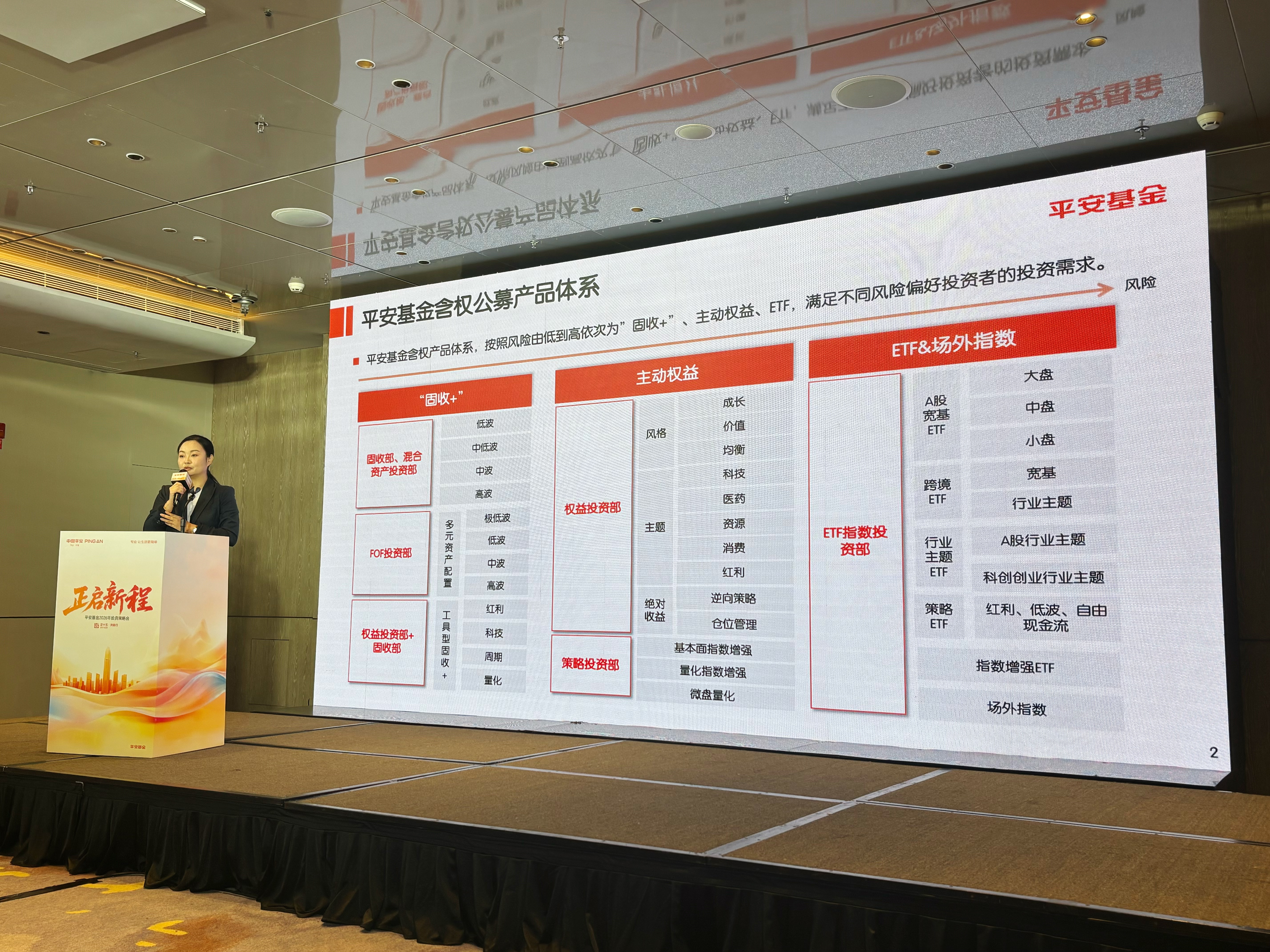 本报讯 (记者昌校宇)1月7日,以“正启新程”为主题的平安基金2026年投资策略会在深圳举行。平安基金产品研发部总经理谢娜在做《多团队、多风格、多策略——平安基金含权公募产品体系介绍》主题演讲时展现了平安基金覆盖不同风险收益特征的投资版图,通过构建多层次含权产品体系,精准匹配不同风险偏好的投资者需求。《证券日报》记者从现场获悉,该体系依据风险由低到高,清晰划分为“固收+”、主动权益和ETF三大板块,旨在为投资者提供一站式的资产配置解决方案。