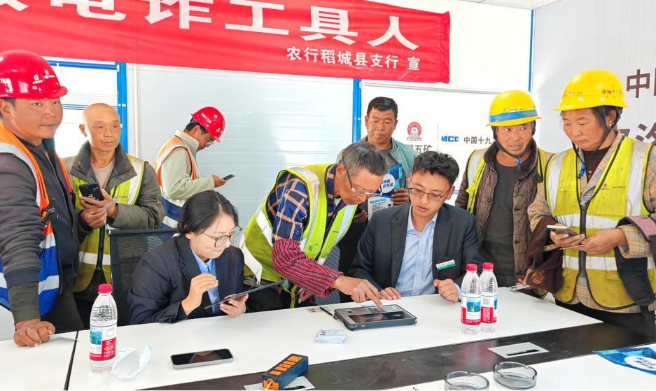 农行稻城县支行工作人员在项目工地为农民工办理业务并开展反诈宣传 农行稻城县支行供图