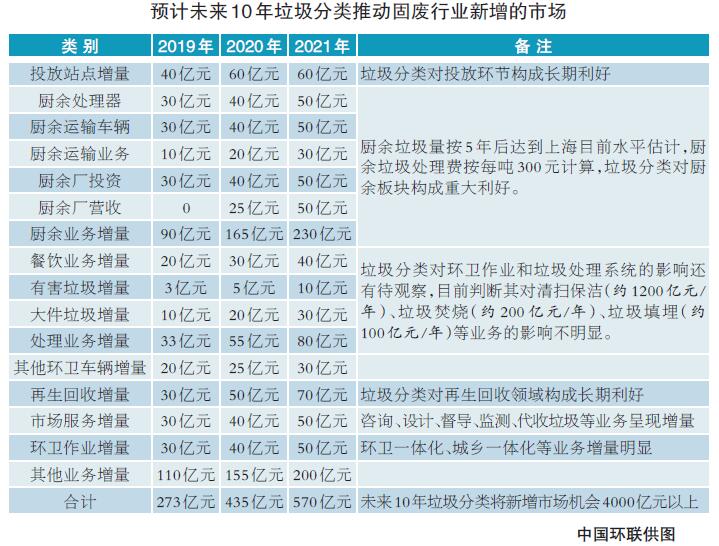 “垃圾分类对环卫作业和垃圾处理系统的影响还有待观察,目前判断垃圾分类对清扫保洁(约1200亿元/年)、垃圾焚烧(约200亿元/年)、垃圾填埋(约100亿元/年)等业务的影响不明显。”张益说。
