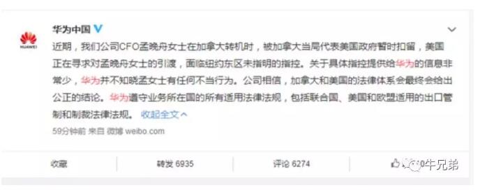 昨天一大早,华为CFO孟晚舟女士在加拿大遭扣留的消息把牛兄弟惊醒。同时,中国驻加拿大使馆迅速表态,“中方已向美、加两国进行了严正交涉,要求它们立即纠正错误做法,恢复孟晚舟女士的人身自由。”当日下午,外交部发言人耿爽也表态,“中方已就此案分别向加方和美方表明了严正立场,要求对方立即对拘押的理由作出澄清,立即释放被拘押的人员,切实保障当事人的合法正当权益。”